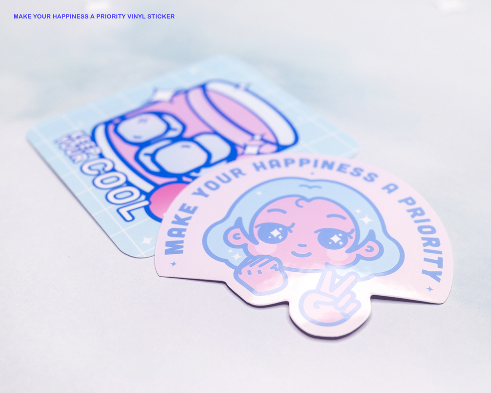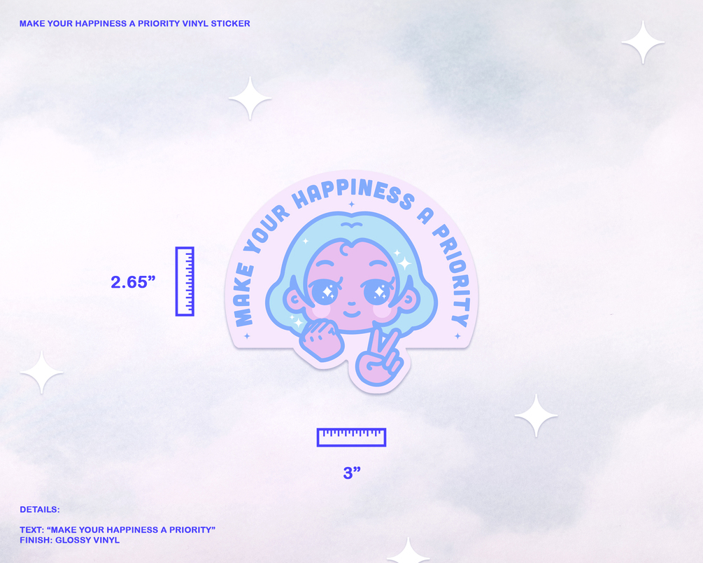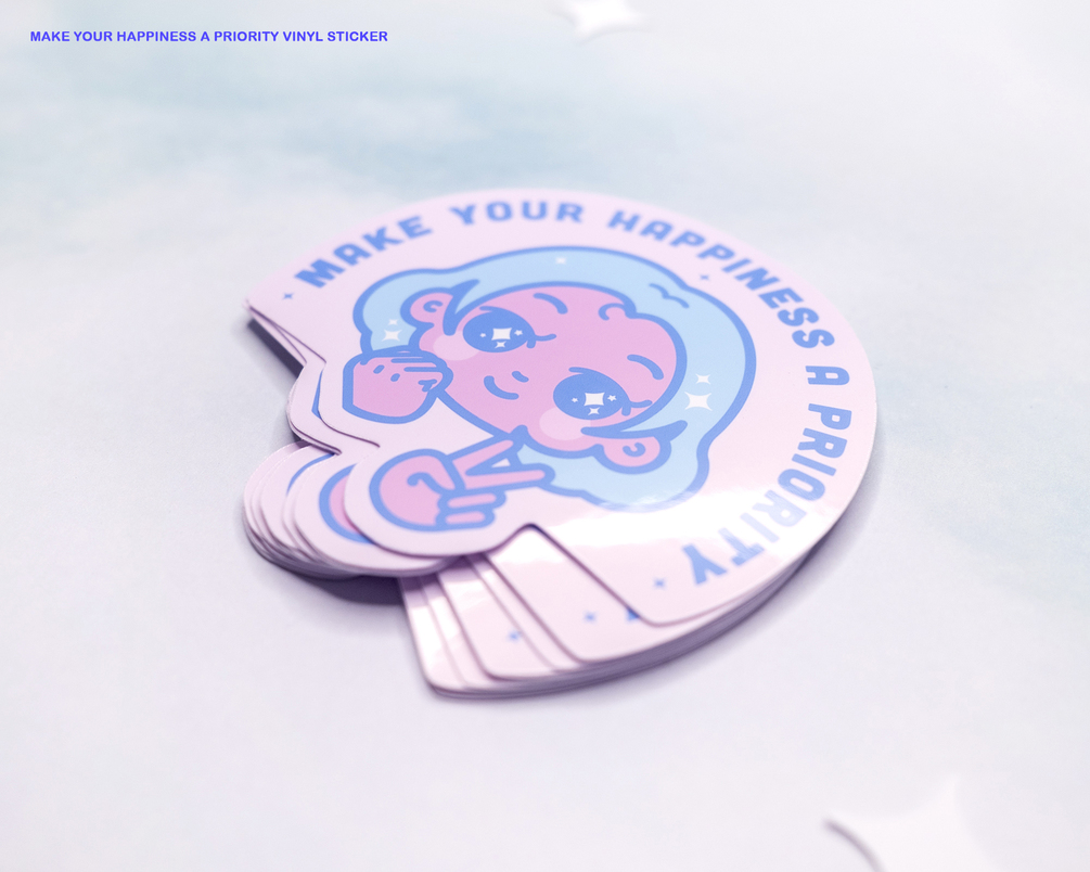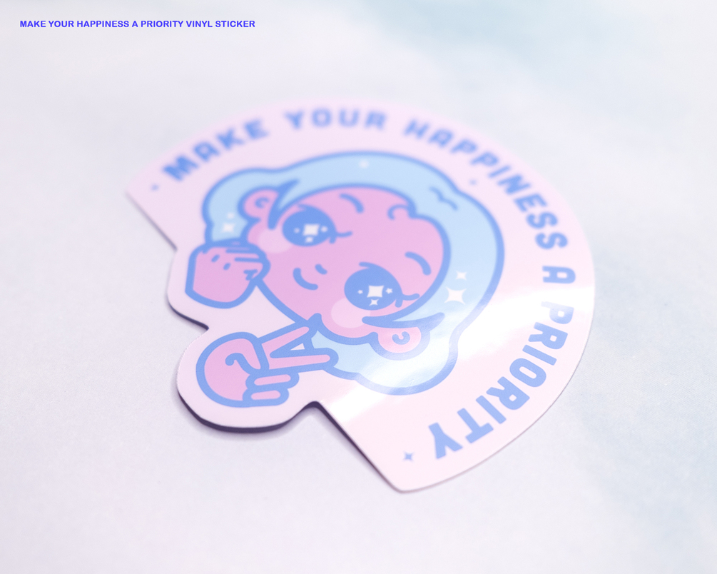 Cute and aesthetic vinyl sticker. She's here to remind you to make your happiness a priority, never forget!
